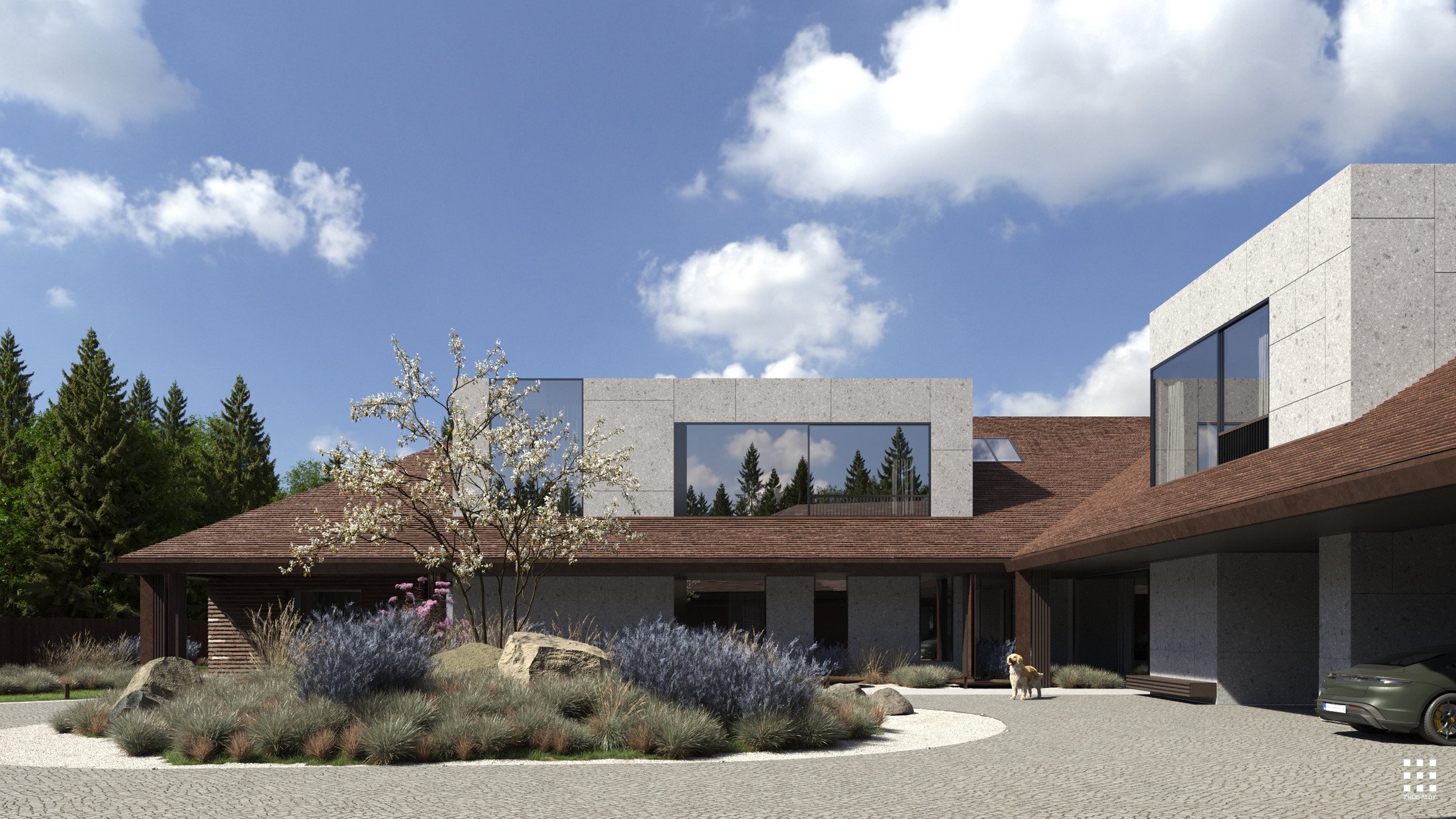 პროექტი დახვეწილ, დახვეწილ ეკლექტიზმს ეფუძნება. კლასიკური ორფერდა სახურავიანი სასახლის არქეტიპი გადამუშავებულია და ავსებს მინიმალისტური ყუთის ფორმის მოცულობებით, რომლებიც ქმნიან რთულ, მრავალშრიან კომპოზიციას.