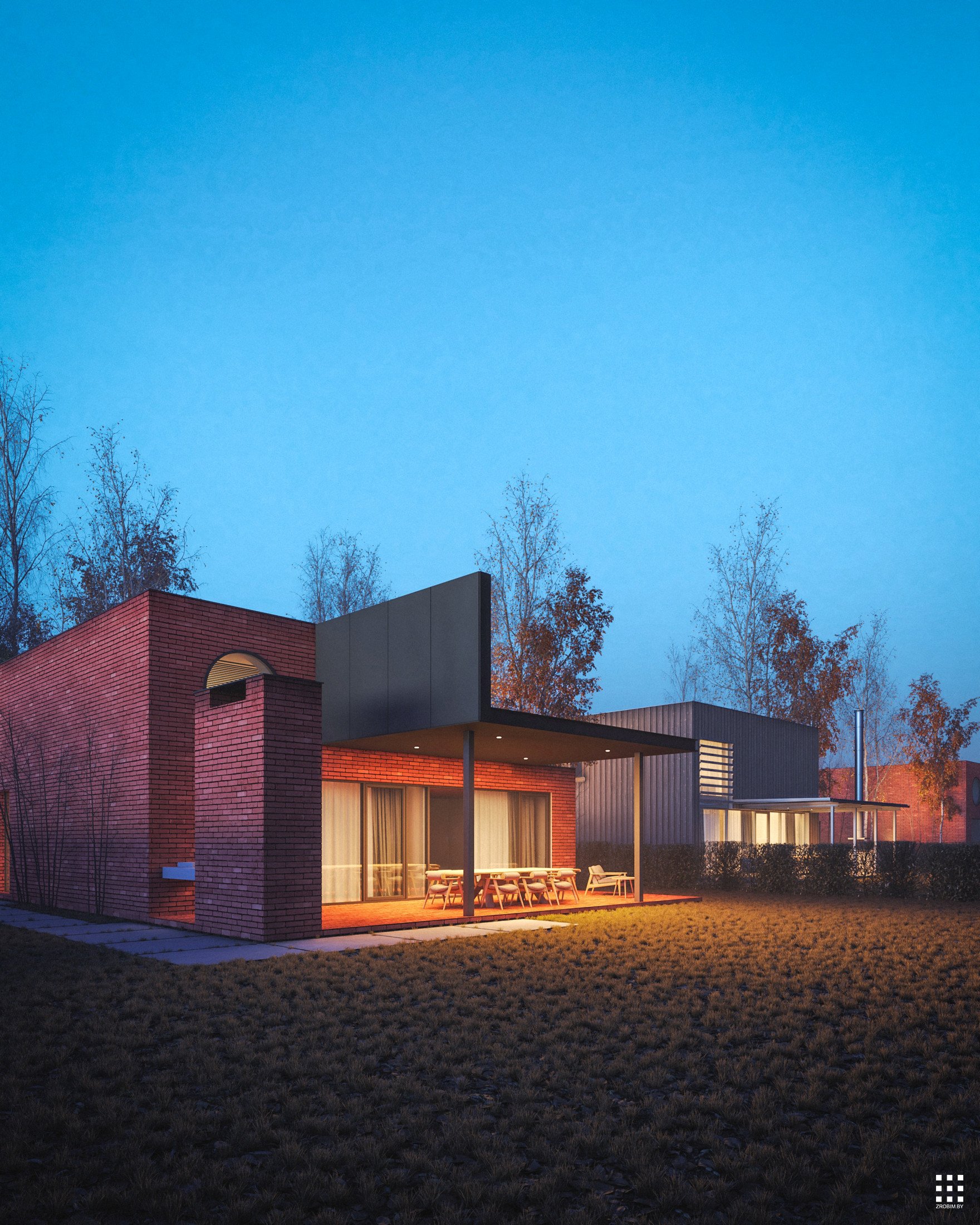 Компактный одноэтажный дом органично вписывается в окружающий ландшафт, оставаясь открытым и светлым. Фасады выполнены из клинкерного кирпича глубокого терракотового оттенка, что подчеркивает теплый характер дома и делает его выразительным акцентом поселка.